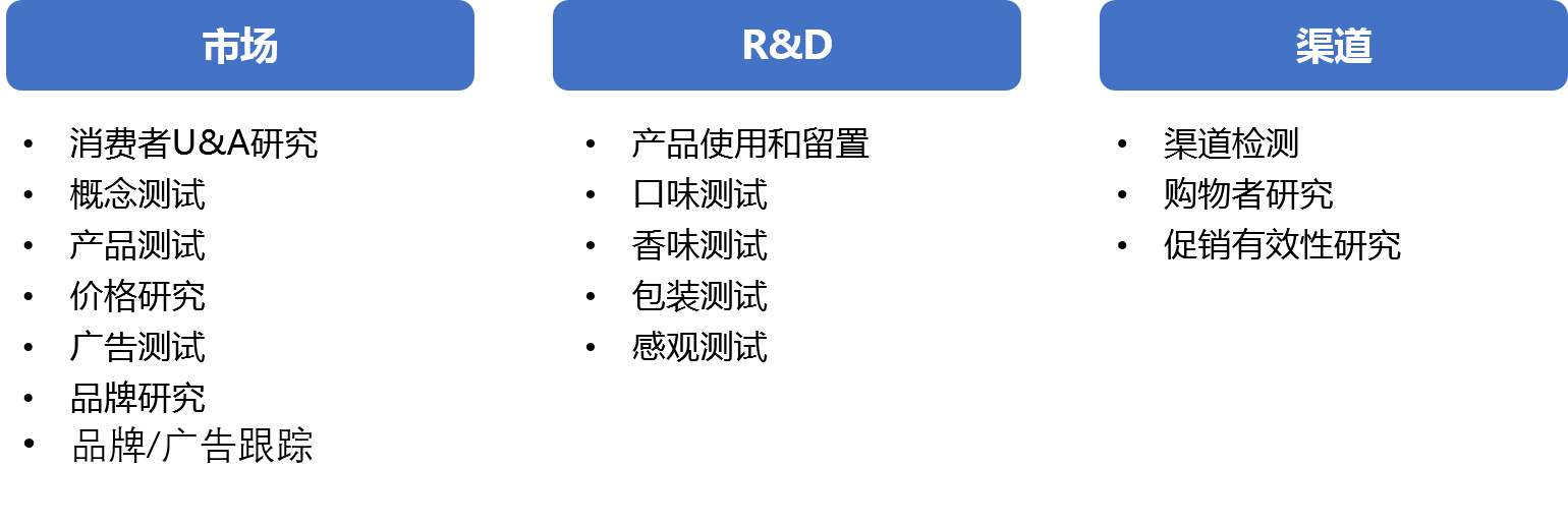 消費品(快消品)研究包含可行性研究、消費者U&A研究、概念測試、市場細(xì)分研究、產(chǎn)品測試、新產(chǎn)品創(chuàng)新開發(fā)、品牌研究及品牌定位、品牌評估與傳播、廣告及活動效果評估、服務(wù)滿意度研究、渠道監(jiān)測等等。華夏經(jīng)緯研究團(tuán)隊提供新產(chǎn)品從機(jī)會識別到上市、量產(chǎn)及升級的全流程服務(wù)。