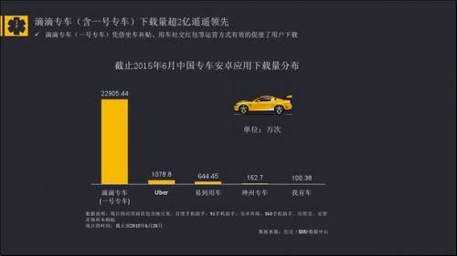 報(bào)告顯示,截止到2015年6月中國(guó)專車安卓應(yīng)用市場(chǎng),滴滴打車(含一號(hào)專車)安卓應(yīng)用市場(chǎng)的下載量為22905.44萬(wàn)次,Uber、易到用車、神州專車等專車應(yīng)用,分別以1078.8萬(wàn)次、644.45萬(wàn)次、162.7萬(wàn)次分列行業(yè)二、三、四位。
