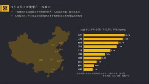 隨著移動(dòng)出行市場(chǎng)的發(fā)展,打車軟件這個(gè)新生事物也逐漸成為人們出行選擇之一。據(jù)報(bào)告顯示,2015年審行半年中國(guó)打車軟件訂單城市TOP10分別是北京(14.2%)、上海(13.6%)、杭州(12.1%)、深圳(11.5%)、廣州(9.3%)、濟(jì)南(7.4%)、沈陽(yáng)(6.2%)、武漢(4.5%)、青島(3.6%)、成都(3.1%)。